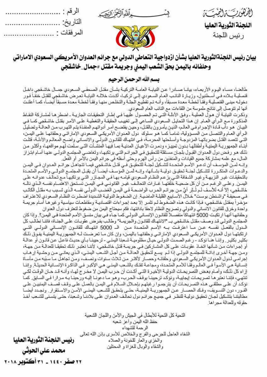 وكان رئيس اللجنة الثورية العليا قد اصدر بيانا بشأن ازدواجية المعايير لدى المجتمع الدولي والترحيب بدعوات وقف الحرب هذا نصه :