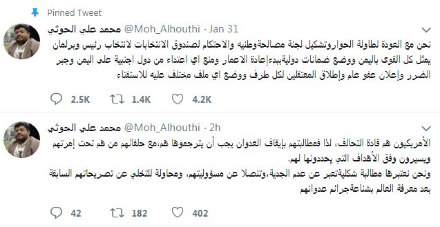 وقال الحوثي على تويتر، أن على مطلقي تصريحات وقف الحرب ترجمة رغبتهم بالعمل على وقف قصف اليمنيين وفك الحصار.