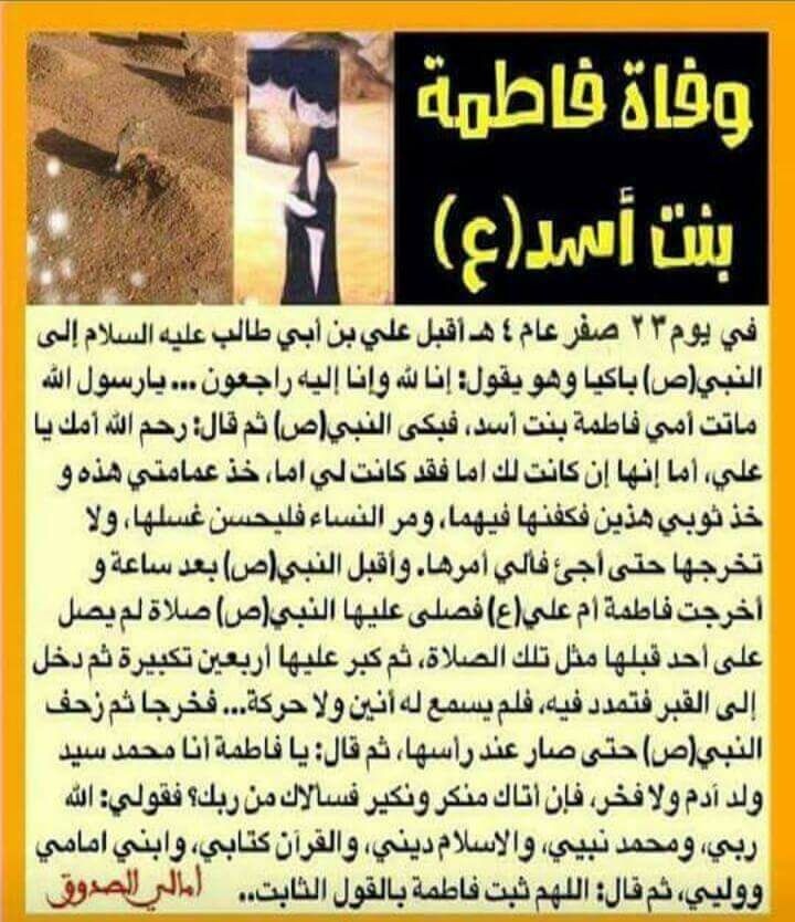 فبينما كان الرسول صلى الله عليه واله وسلم ذات يوم قاعد إذ أتاه أمير المؤمنين عليه السلام وهو يبكي فقال له رسول الله صلى الله عليه واله: ما يبكيك؟ فقال: ماتت أمي فاطمة فقال رسول الله: وامي والله وقام مسرعا حتى دخل فنظر إليها وبكى ثم أمر النساء أن يغسلنها .