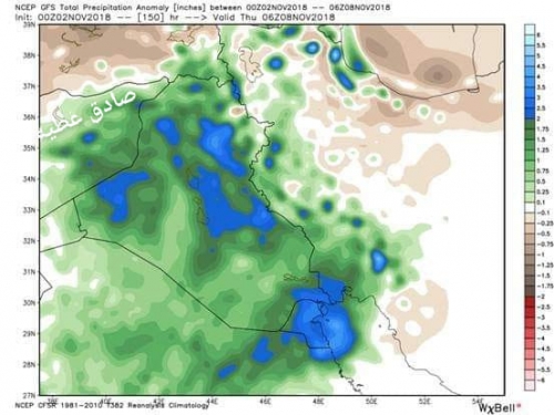 وأضاف كما يشير الموديل الى "انها ستبلغ في بعض المناطق حاجز 75 ملم فوق المعدل لمثل هذا الوقت من السنة" مبيناً ان "المناطق التي حددها الموديل بهذه الكمية هي {الانبار- كركوك- ديالى- بغداد- البصرة- جنوب ميسان- واسط- كربلاء وبابل ومناطق من الموصل ودهوك}"