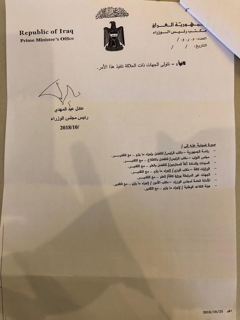 العراق - الكوثر: صدر، امر ديواني من رئيس الوزراء عادل عبد المهدي تضمن احالة رئيس الوزراء السابق وباقي الوزراء في الحكومة السابقة الى التقاعد.