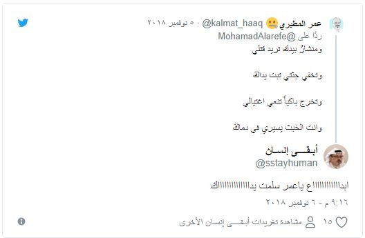 وتفاعل الجمهور مع العريفي بمجاراته بأبيات على نفس الوزن والقافية، إلا أن أحد المغردين، ويدعى عمر المطيري، رد على العريفي بكلمات مثيرة، في تلميح منه إلى قضية مقتل الكاتب السعودي جمال خاشقجي.
