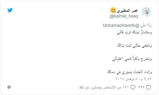 وقال المطيري مجاريا العريفي: “ومنشارٌ بيدك تريد قتلي.. وتخفي جثتي تبت يداكَ.. وتخرج باكيا تنعي اغتيالي..  وأنت الخبث يسري في دماكَ”.