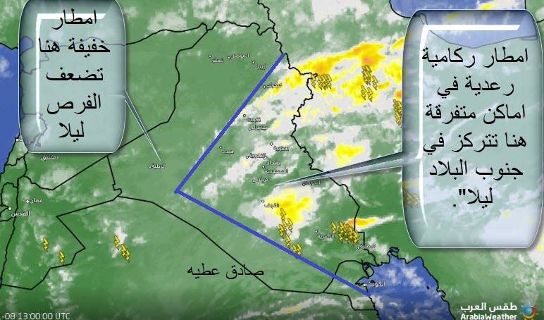 وقال عطيه في صفحة التواصل الاجتماعي {الفيبسبوك} ان" فرصة عموم المدن من الامطار تقل خلال الليل وتندفع الحالة الممطرة نحو الجنوب الليلة ويوم غد الجمعة أيضا"، مضيفا ان" الحالات ماتزال تتابع على البلاد في الايام المقبلة حيث تشير التنبؤات الجوية فرصة الامطار يوم الجمعة ستكون على مدن الجنوب فقط وتحديدا مدينة البصرة رغم ضعف الحالة الجوية المؤثرة حاليا مما كان متوقعا لها بسبب اندفاع تيارات هوائية من المرتفع السيبيري".