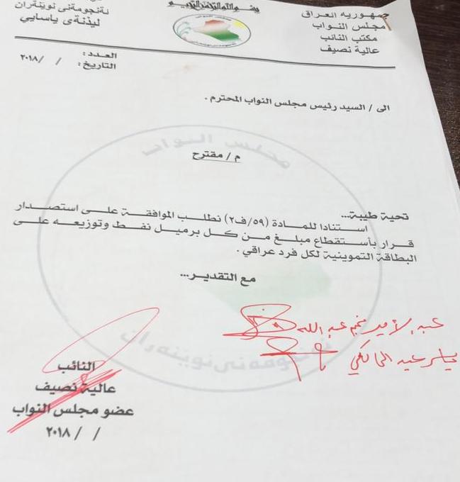 وذكر في بيان اليوم ان "النائبة عالية نصيف قدمت طلباً الى رئاسة مجلس النواب معززاً بتواقيع خمسين نائباً، بالموافقة على استصدار قرار باستقطاع مبلغ من كل برميل نفط وتوزيعه ضمن البطاقة التموينية لكل فرد عراقي، وذلك استناداً الى المادة {59/ف2}".
