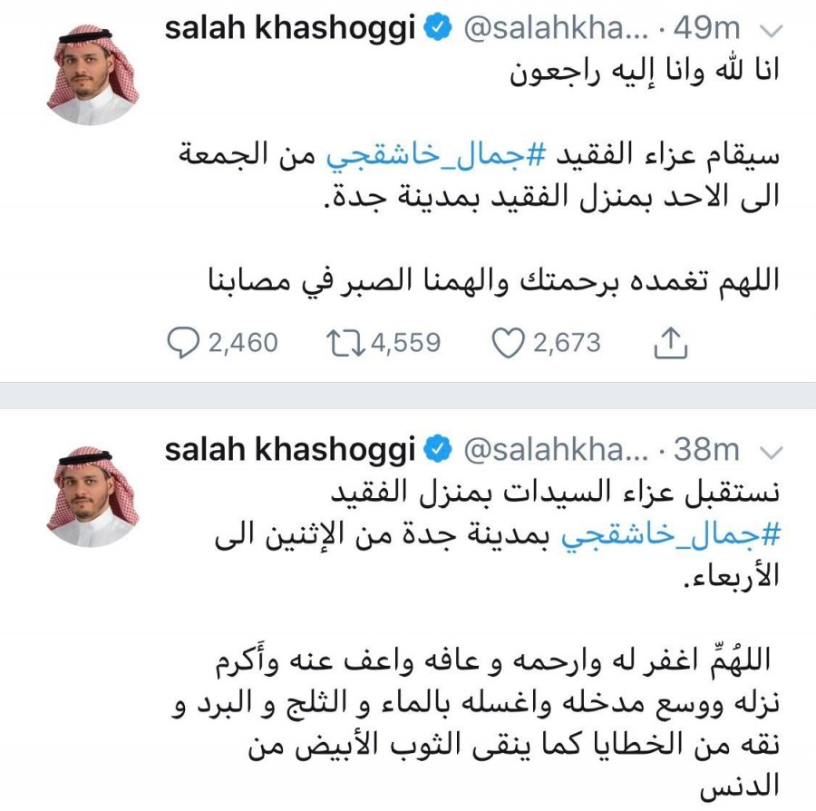 بعد ساعات من كشف النيابة العامة السعودية عن نتائج التحقيقات التي أجرتها مع الموقوفين في قضية قتل والده في القنصلية السعودية في إسطنبول، أعلن صلاح خاشقجي في حسابه بتويتر عن إقامة عزاء لوالده غداً الجمعة إلى الأحد بمنزله في مدينة جدة.