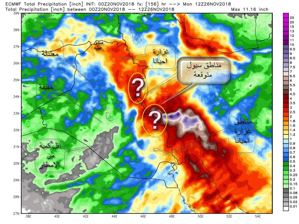 خارطة لكميات الامطار التراكمية لغاية يوم الاثنين من الموديل الاوروبي تشير الى مدن الشرق والشمال هي الاعلى كمية .