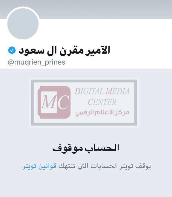اعلن مركز الاعلام الرقمي DMC ان شركة "تويتر" اوقفت حسابا موثقا يحمل اسم الامير مقرن ال سعود شقيق الملك السعودي.