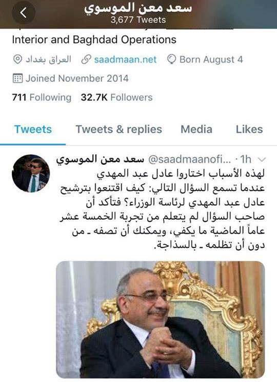ونشر الهكرز تغريدة نسبت الى معن وتضمنت انتقاد لرئيس الوزراء عادل عبد المهدي وللحكومة الحالية.