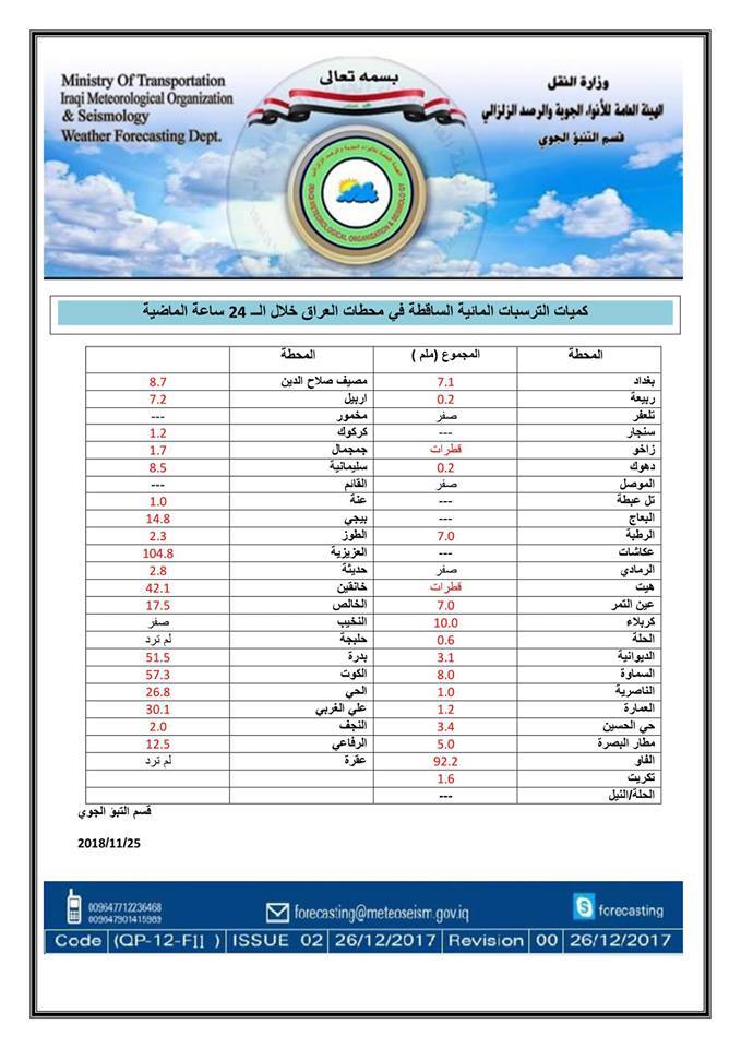 العراق_الكوثر: نشرت هيئة الانواء العراقية تقريرآ مفصلآ حول كمية الامطار المتساقطة خلال 24 ساعة الماضية.