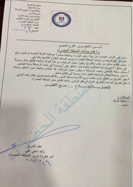 العراق_الكوثر:انتشرت صورة عن" كتاب رسمي صادر عن آمر مرور مفرزة المنطقة الخضراء موجها الى قاطع مرور الكرخ الجنوبي، يتضمن أسماء مداخل المنطقة المقرر اعادة افتتاحها". وجاء فيه :