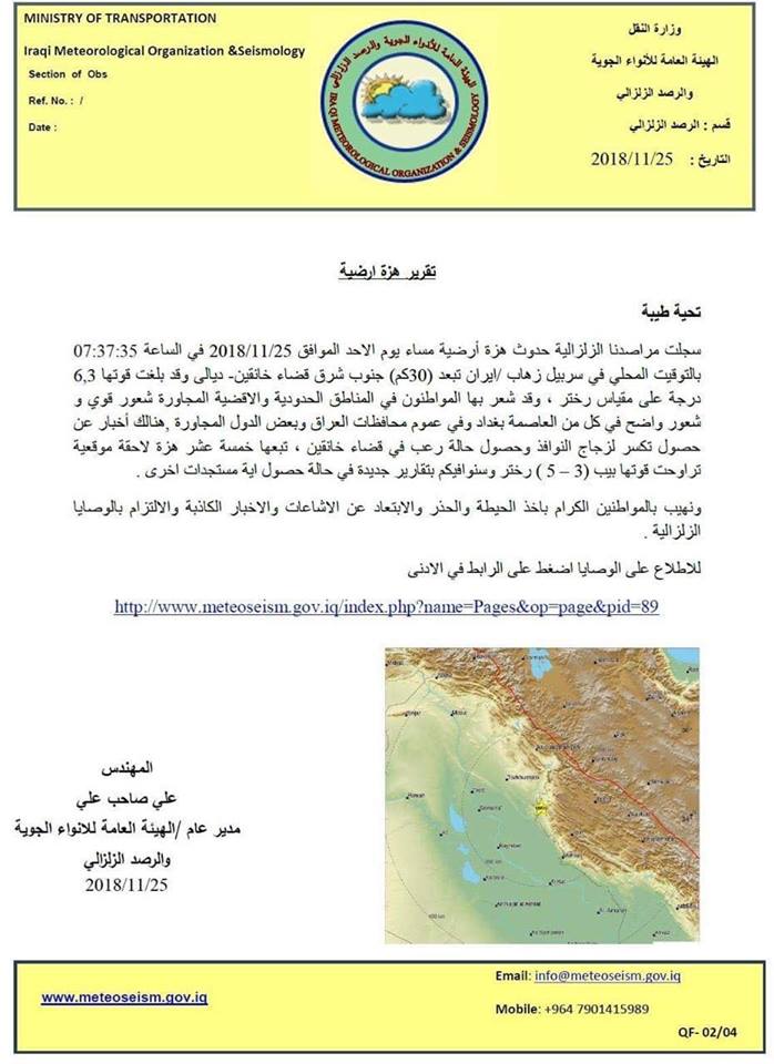 العراق_الكوثر: نشرت هيئة الانواء الجوية، الاحد، تقريرا بشأن الهزة التي ضربت العاصمة بغداد وعدد من المحافظات، فيما اكدت ان الهزة مصدرها من ايران.