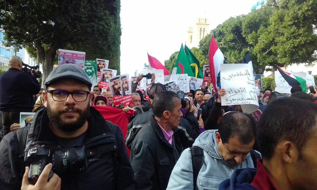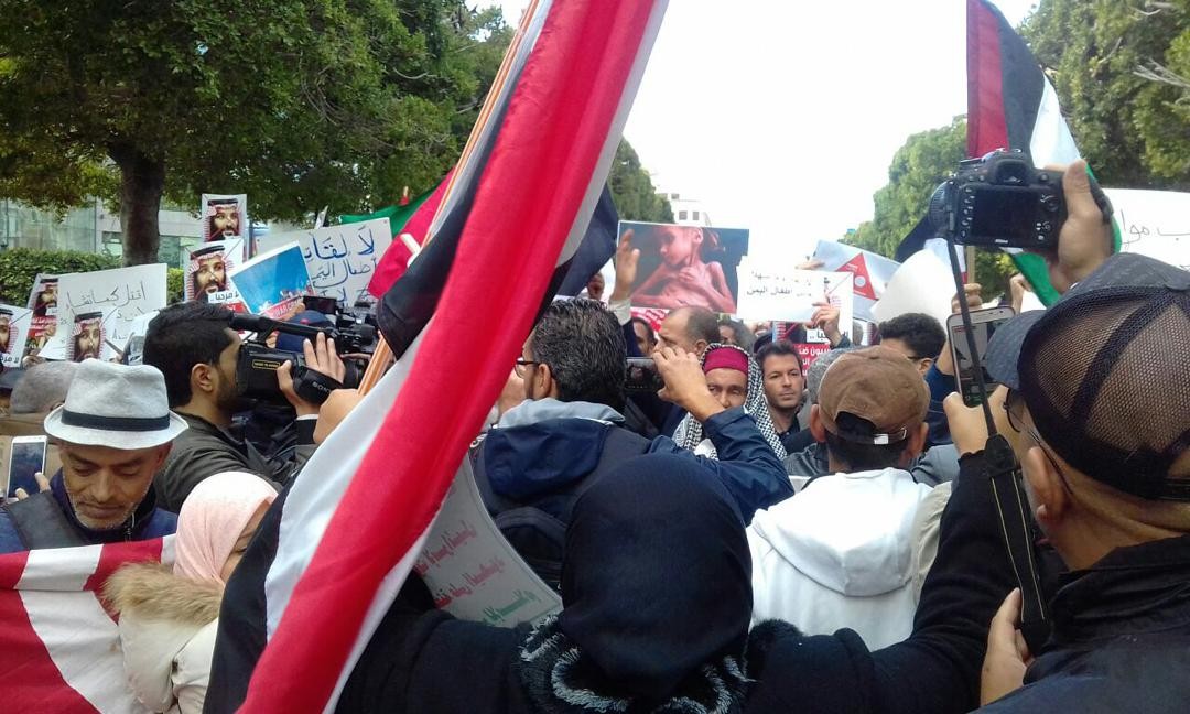 وكان محتجون تجمعوا مساء أمس وسط العاصمة التونسية بدعوة من عشر منظمات، بينها: النقابة الوطنية للصحفيين التونسيين، والرابطة التونسية للدفاع عن حقوق الإنسان، وجمعية النساء الديمقراطيات؛ احتجاجا على الزيارة، ورفعوا لافتات كُتب عليها "بن سلمان مجرم حرب" و"قاتل أطفال اليمن"، في حين قام مهرج بتجسيد شخصيته وهو يخرج من حقيبته أعضاء مضرجة بالدم.