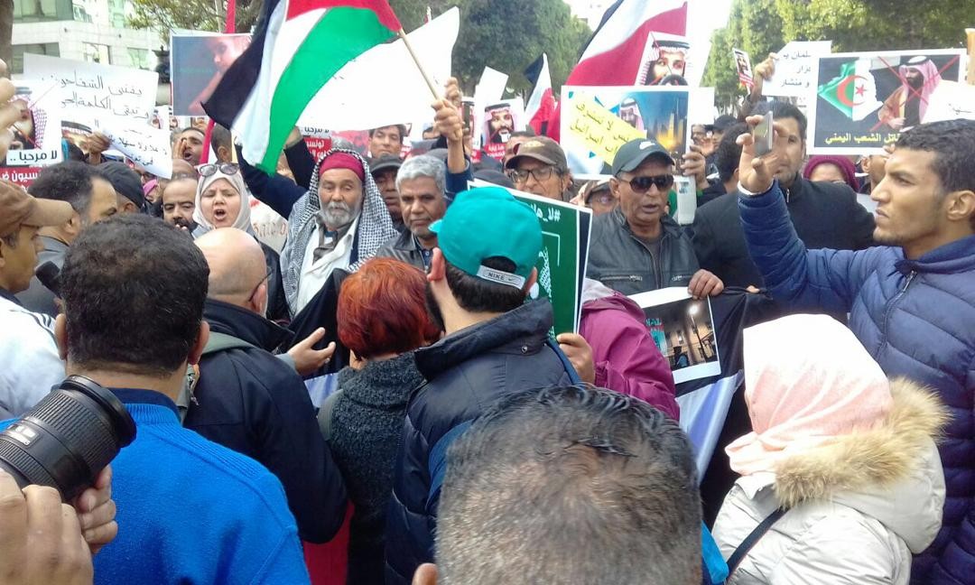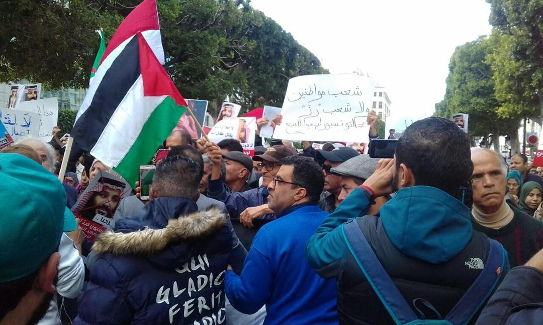 ورفع المحتجون شعارات من قبيل "تونس ليست للبيع" و"الشعب يريد طرد بن سلمان"، كما رفعوا أعلام تونس والجزائر وموريتانيا ومصر وفلسطين.