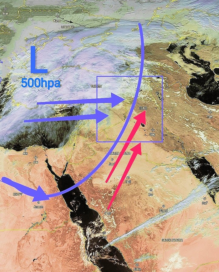 وذكر المتنبىء الجوي أبو أحمد عيايدة، في منشور على صفحة "طقسكم" المتخصصة بالتوقعات الجوية في المنطقة، اليوم، 28 تشرين الثاني 2018، انه خلال الـ "46 ساعة المقبلة تبدأ امطار العراق من الشمال الغربي وتنتشر تدريجيا، نتيجة لعبور حوض علوي بارد في طبقات الجو العليا في ظل فارق حراري ورطوبة بنائية" .