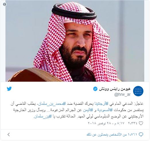 وتابعت في التغريدة أن القاضي يطلب أن يستفسر من حكومات السعودية واليمن عن الجرائم المزعومة، مضيفة:”ويسأل وزير الخارجية الأرجنتيني عن الوضع الدبلوماسي لولي العهد.”