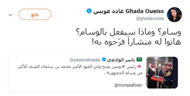 وقامت غادة عويس بتعليق على صورة منح الرئيس التونسي "الصنف الأكبر" من وسام الجمهورية الى إبن سلمان قائلة: