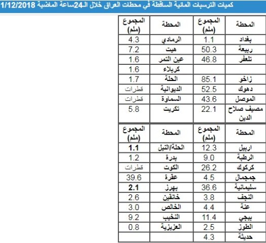 وقالت الهيئة في تقرير لها، ان "كميات الامطار التي سقطت خلال الساعات الماضية احتلت فيها مدينة زاخو بـ85.1 ملم تلتها دهوك بـ52.5 ملم وربيعة بـ50.3 ملم".