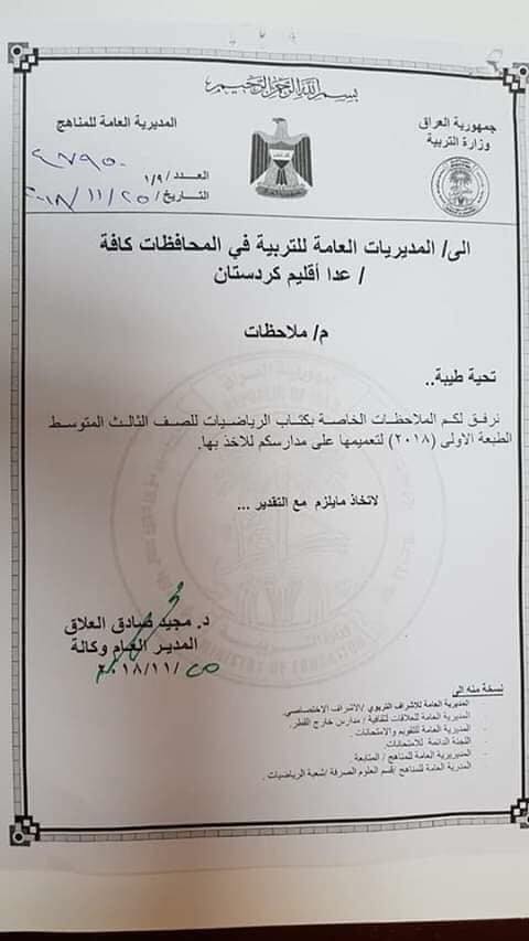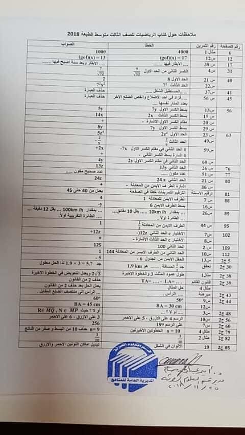ونوهت التربية "بوجود هذه الأخطاء التي لا تتعدى ان تكون مطبعية وملاحظات لتبسيط الحل وأخرى لغوية وفنية وهذا الامر يحصل في الكتب المدرسية في بعض الدول، حيث يتم وضع في نهاية كل كتاب مدرسي صفحتين فارغتين بيضاء تُخصص لتدوين الأخطاء والملاحظات ان وجدت من قبل المعنيين، اما فيما يخص كثرة الاسئلة العلمية حول موضوع المبرهنة والتمرين، فقد عمدت المديرية على وضعها لغرض توفير مهاره للطلاب في فهم العمليات الرياضية وهذه معايير عالية".