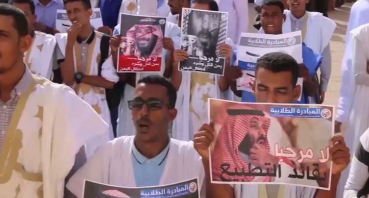وكانت المبادرة الطلابية لمناهضة الاختراق الصهيوني والدفاع عن القضايا العادلة في موريتانيا قد نظمت الجمعة الماضي وقفة بساحة الجامع الكبير المعروف بالجامع السعودي في العاصمة نواكشوط، وردد المشاركون هتافات رافضة لزيارة ولي العهد السعودي.