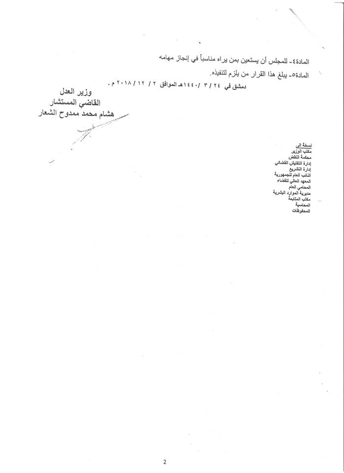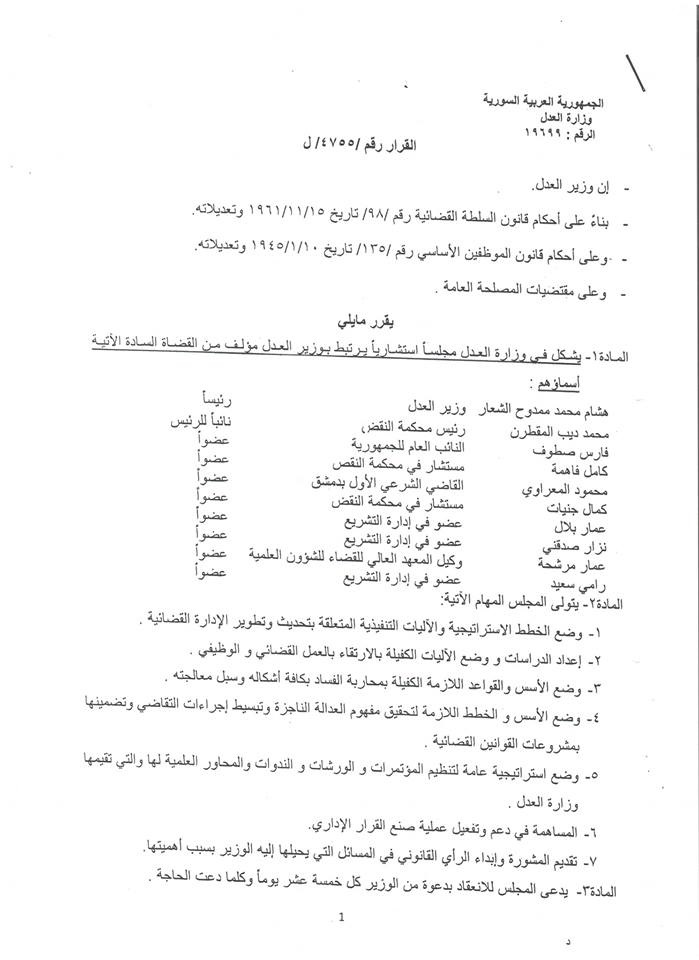 صدر القرار برقم /4755/ لتاريخ 2/12/2018 ويتضمن تشكيل مجلس استشاري يرتبط بوزير العدل السوري، ويتولى هذا المجلس المهام التالية: