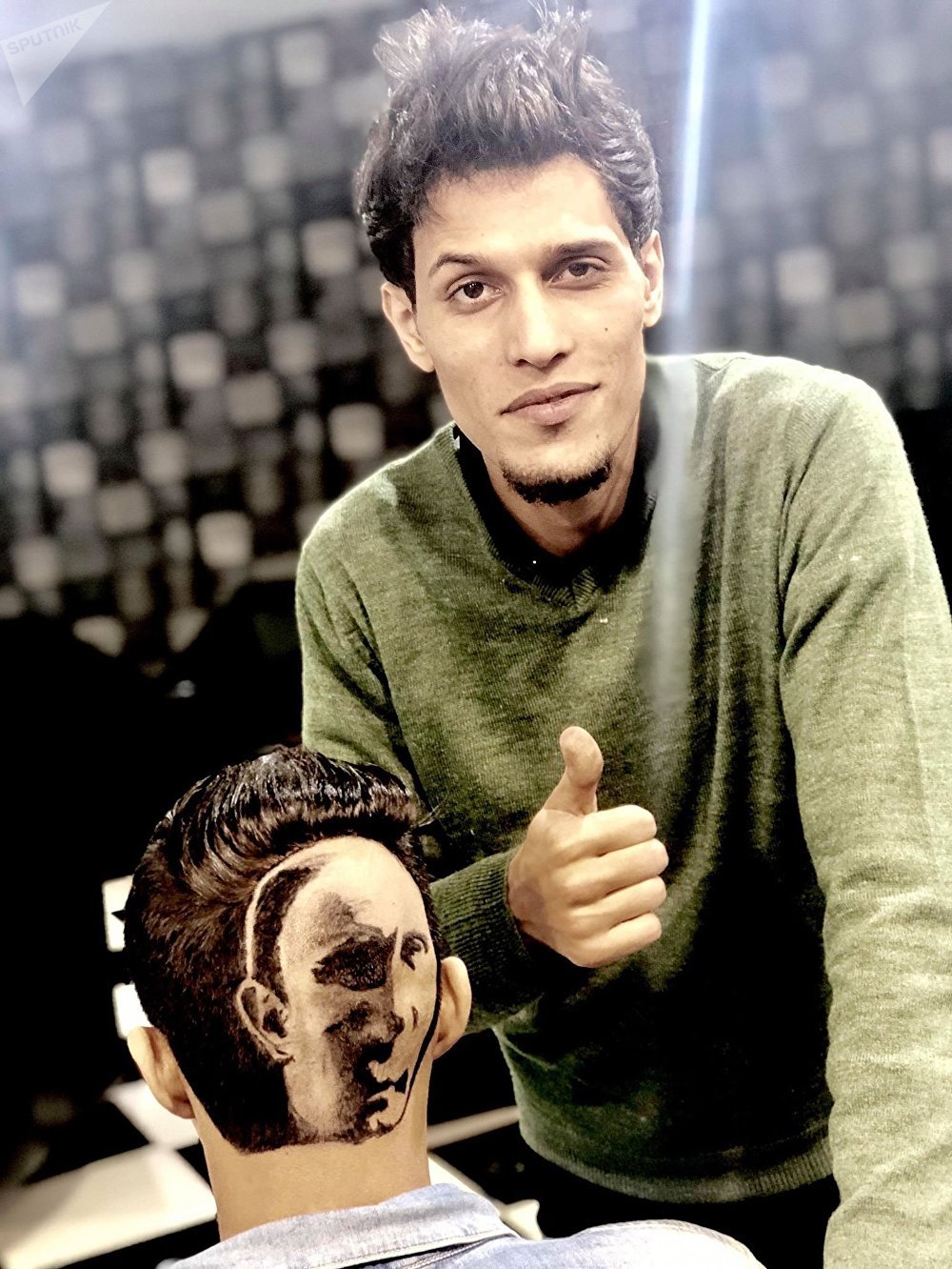 ليتفنن برسومات لشخصيات عالمية على الرأس، من خلال الرسم بالمقص والمشط ويزين الرؤوس بأشكال ورسومات مبهرة، حيث قام هذا الشاب برسم الرئيس الروسي، فلاديمير بوتين على راس شاب ليبي.
