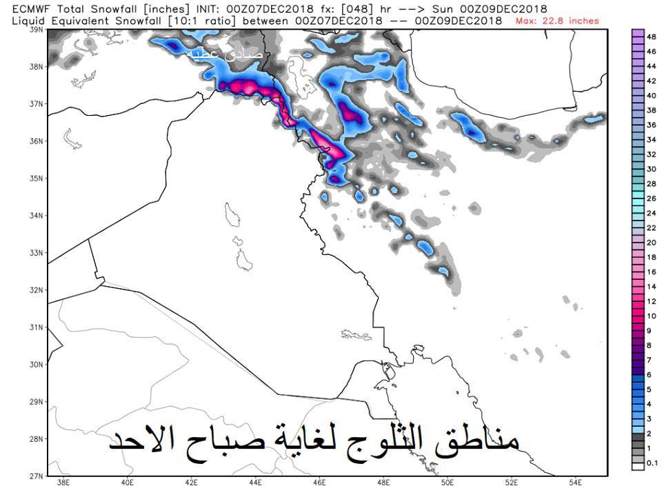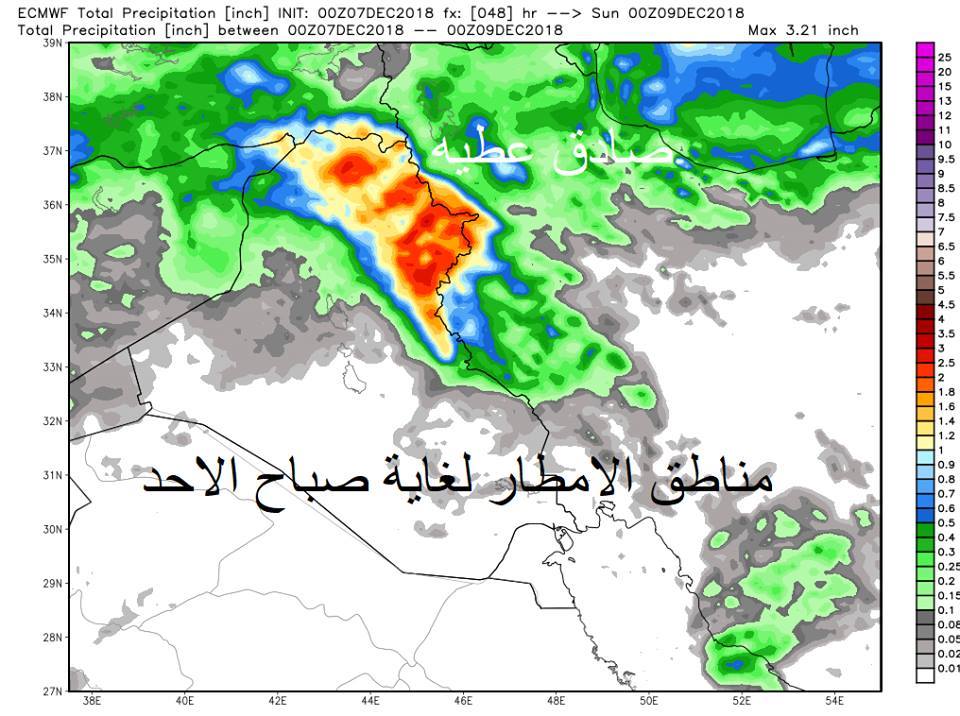 وتابع ان "فرص الامطار الخفيفة نهار وليل يوم السبت واردة في ( سليمانية- كركوك- دهوك- صلاح الدين- الموصل- وديالى - شمال واسط ) والغزارة موقعة في اربيل ودهوك وشرق الموصل وكركوك واجزاء من سليمانية وديالى" .