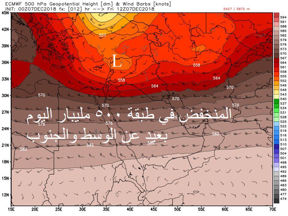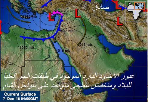 وذكر المتنبىء الجوي صادق العطية في تدوينة له على حسابه بموقع التواصل الجتماعي فيسبوك اليوم (7 كانون الاول 2018)، ان "الامطار حاليا قد تركزت على الوسط والشمال وفرصة الجنوب كانت هي الاقل والسبب هو تمركز مرتفع سطحي وابتعاد محور المنخفض العلوي الذي سبب نقص التبريد اللازم في طبقات الجو العليا و سبب ضعف فرص الهطول" .