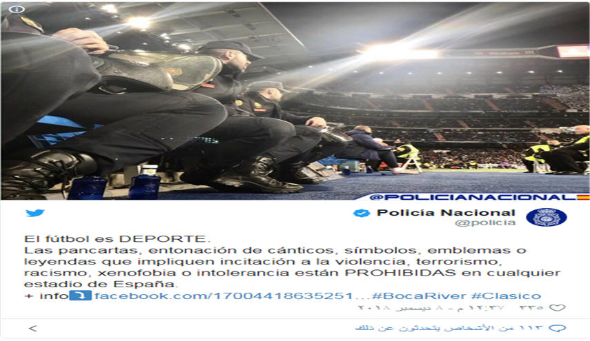وخصصت السلطات الإسبانية 4 آلاف عنصر أمني لتأمين المباراة التي كان من المقرر إقامتها في 24 نوفمبر/تشرين ثان الماضي على ملعب "المونومنتال" معقل ريفر بليت، لولا تعرض حافلة بوكا للاعتداء من قبل مشجعي الخصم أثناء توجهها للملعب، ليتم تأجيل اللقاء مرتين قبل أن يتقرر في النهاية نقله لمدريد غدا الأحد.