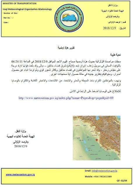 وقالت الهيئة ان "هزة ارضية ضربت منطقة سربيل زهاب في ايران بلغت قوتها 4.5 درجات على مقياس ريختر"، مبينة ان "الاهالي في قضاء خانقين وكلار شعروا بالهزة بشكل قوي". واضافت انه "لم تردنا انباء عن حصول اضرار".