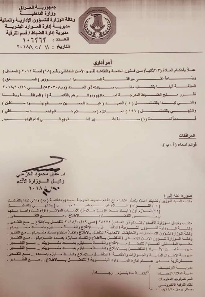 أعلن محافظ النجف الاشرف، لؤي الياسري، عن صدور الامر الوزاري بترقية عدد من ضباط ومراتب قيادة شرطة محافظة النجف الأشرف.