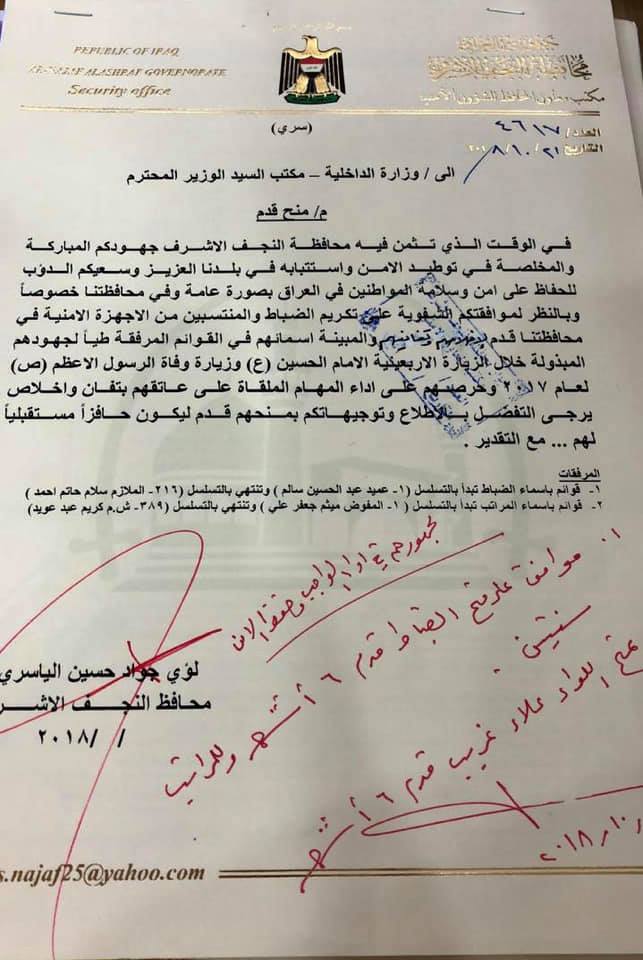 وذكر بيان لمكتبه ان "المحافط كان قد طالب وزارة الداخلية بكتاب رسمي بترقيتهم تثمينا لجهودهم الكبيرة في الزيارات المليونية وحفظ امن المدينة المقدسة".