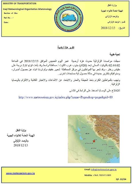 وقال القسم في تقريره، ان "قوة الهزة بلغت 3.8 درجات على مقياس ريختر"، مشيرا الى ان "المواطنين شعروا فيها بمركز المحافظة". وتابع "انه لم تردنا انباء عن حصول اضرار".