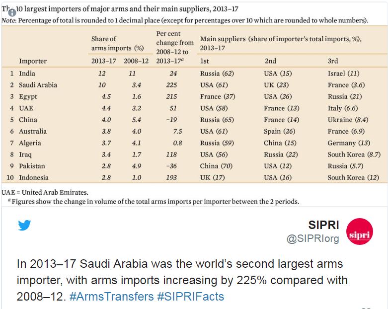 وتستورد 5 دول عربية ربع السلاح حول العالم، وهي مصر والسعودية والإمارات والجزائر والعراق.