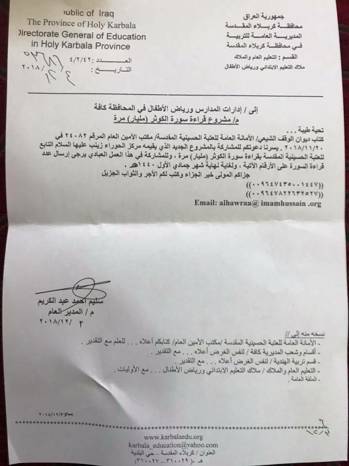 وجاء في الوثيقة الصادرة من المديرية العامة للتربية، انه استنادا الى "كتاب ديوان الوقف الشيعي/ الامانة العامة للعتبة الحسينية المقدسة/ يسرنا دعوتكم للمشاركة بالمشروع الجديد الذي يقيمه مركز الحوراء بقراءة سورة الكوثر (مليار) مرة".