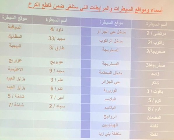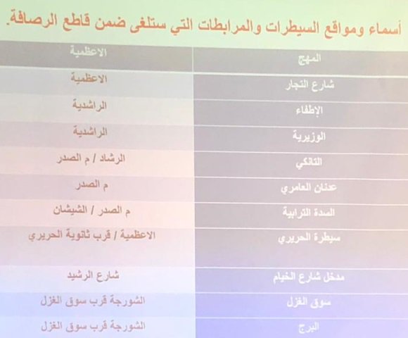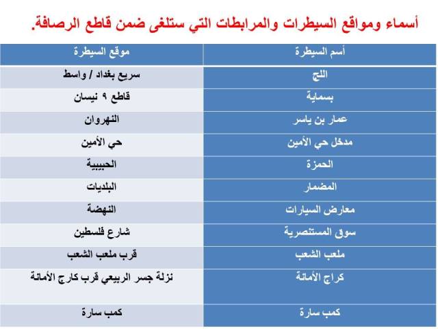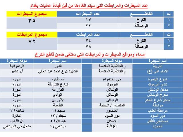 واضاف ان "22 سيطرة سترفع اليوم من جانب الرصافة، و13 سيطرة سترفع يوم غدا من جانب الكرخ"، مشيرا الى انه سيتم رفع 36 مرابطة من جانب الرصافة و34 اخرى من جانب الكرخ".