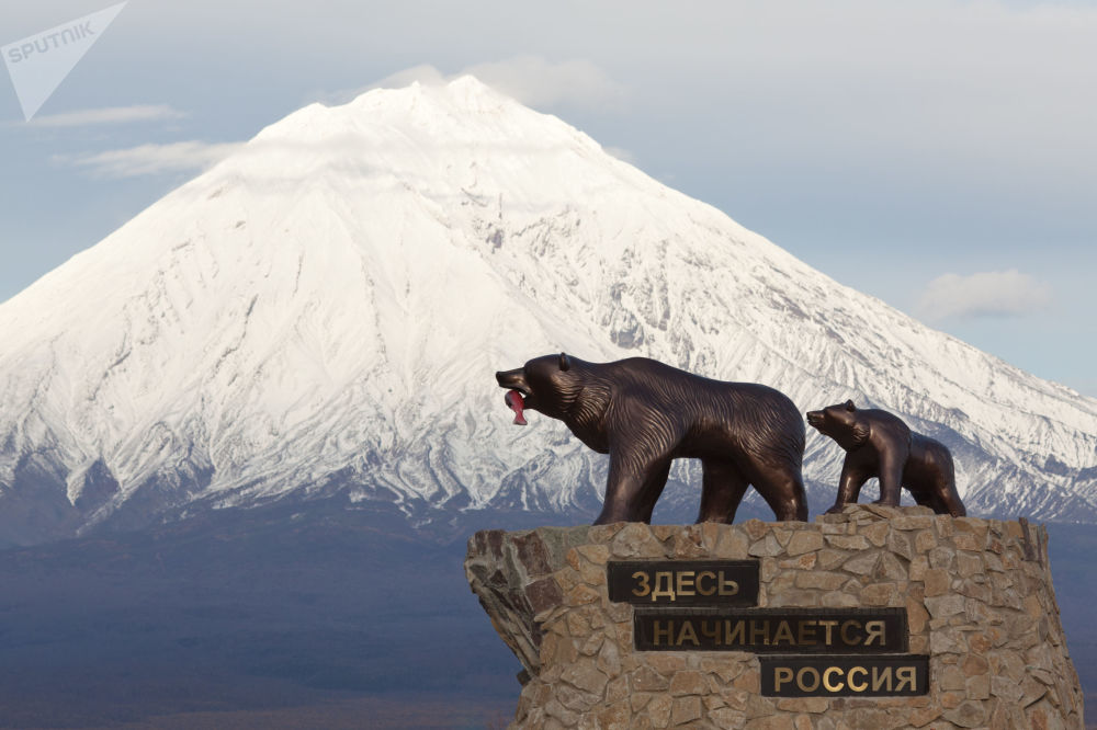 تمثال الدب الأم وصغيرها على مدخل مدينة يليزوفو في إقليم كامشاتكا