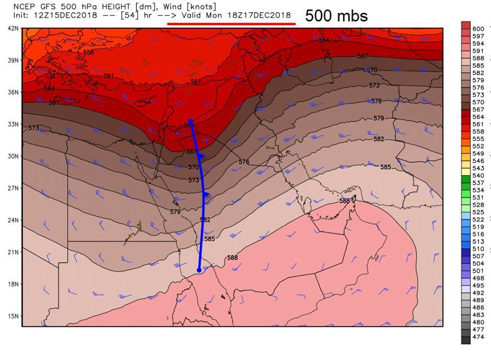 وقال عطيه على موقع التواصل الاجتماعي {الفيسبوك}" نلاحظ من خارطة 850 mbs انسياب واضح للرياح المدارية نحو مركز خلية للضغط المنخفض تقع جنوب غرب البلاد ناتجة من تفاعل خفيف لمنخفض البحر الأحمر مع المنخفض المتوسطي يسبب انحدار ضغط عالي امام المنخفض يصاحبة نشاط للرياح السطحية ليل الاثنين".