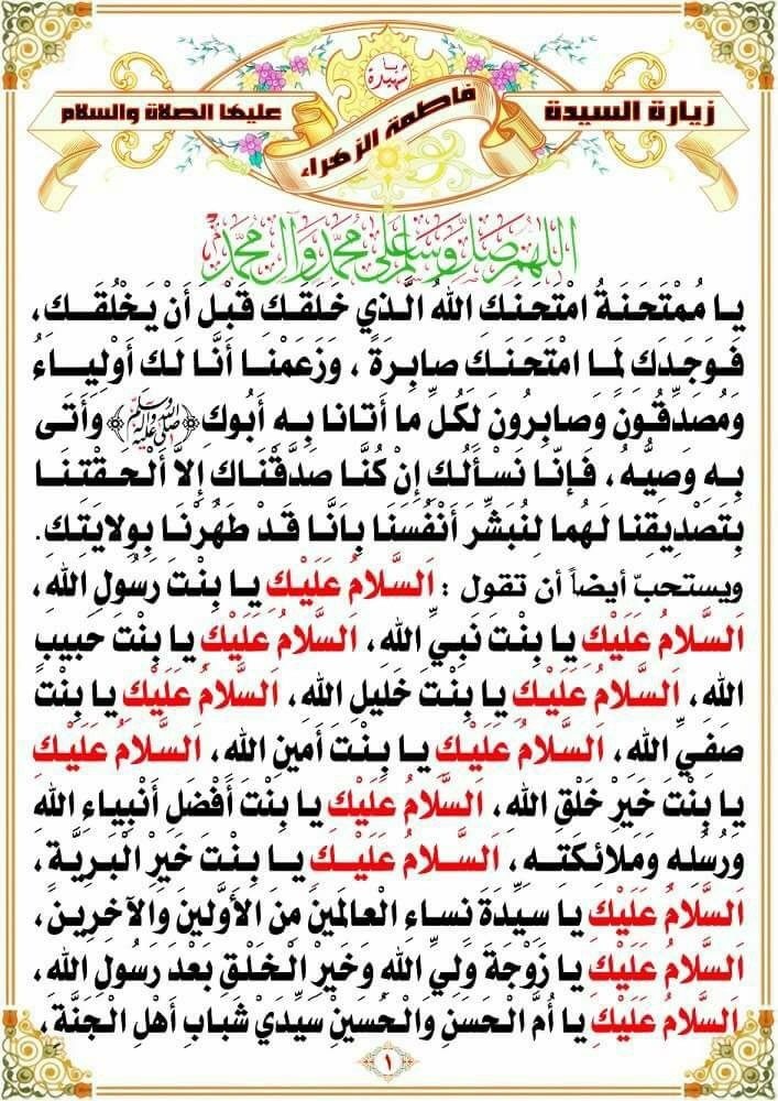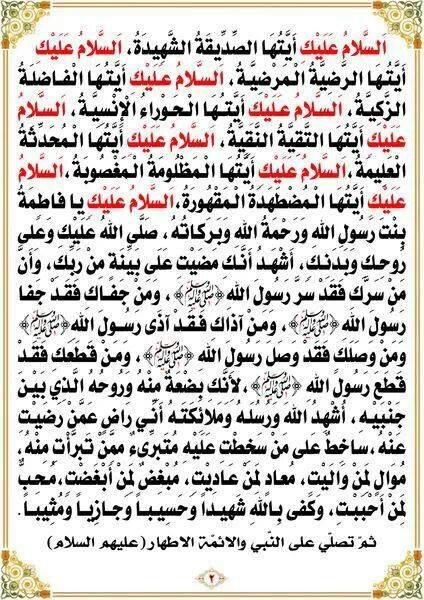 يَا مُمْتَحَنَةُ امْتَحَنَكِ اللَّهُ الَّذِي خَلَقَكِ قَبْلَ أَنْ يَخْلُقَكِ فَوَجَدَكِ لِمَا امْتَحَنَكِ صَابِرَةً وَ زَعَمْنَا أَنَّا لَكِ أَوْلِيَاءُ وَ مُصَدِّقُونَ وَ صَابِرُونَ لِكُلِّ مَا أَتَانَا بِهِ أَبُوكِ صَلَّى اللَّهُ عَلَيْهِ وَ آلِهِ وَ أَتَى (أَتَانَا) بِهِ وَصِيُّهُ فَإِنَّا نَسْأَلُكِ إِنْ كُنَّا صَدَّقْنَاكِ إِلاَّ أَلْحَقْتِنَا بِتَصْدِيقِنَ لَهُمَا لِنُبَشِّرَ أَنْفُسَنَا بِأَنَّا قَدْ طَهُرْنَا بِوِلاَيَتِكِ اَلسَّلاَمُ عَلَيْكِ يَا بِنْتَ رَسُولِ اللَّهِ السَّلاَمُ عَلَيْكِ يَا بِنْتَ نَبِيِّ اللَّهِ السَّلاَمُ عَلَيْكِ يَا بِنْتَ حَبِيبِ اللَّهِ السَّلاَمُ عَلَيْكِ يَا بِنْتَ خَلِيلِ اللَّهِ السَّلاَمُ عَلَيْكِ يَا بِنْتَ صَفِيِّ اللَّهِ السَّلاَمُ عَلَيْكِ يَا بِنْتَ أَمِينِ اللَّهِ السَّلاَمُ عَلَيْكِ يَا بِنْتَ خَيْرِ خَلْقِ اللَّهِ السَّلاَمُ عَلَيْكِ يَا بِنْتَ أَفْضَلِ أَنْبِيَاءِ اللَّهِ وَ رُسُلِهِ وَ مَلاَئِكَتِهِ السَّلاَمُ عَلَيْكِ يَا بِنْتَ خَيْرِ الْبَرِيَّةِ السَّلاَمُ عَلَيْكِ يَا سَيِّدَةَ نِسَاءِ الْعَالَمِينَ مِنَ الْأَوَّلِينَ وَ الْآخِرِينَ السَّلاَمُ عَلَيْكِ يَا زَوْجَةَ وَلِيِّ اللَّهِ وَ خَيْرِ الْخَلْقِ بَعْدَ رَسُولِ اللَّهِ السَّلاَمُ عَلَيْكِ يَا أُمَّ الْحَسَنِ وَ الْحُسَيْنِ سَيِّدَيْ شَبَابِ أَهْلِ الْجَنَّةِ السَّلاَمُ عَلَيْكِ أَيَّتُهَا الصِّدِّيقَةُ الشَّهِيدَةُ السَّلاَمُ عَلَيْكِ أَيَّتُهَا الرَّضِيَّةُ الْمَرْضِيَّةُ السَّلاَمُ عَلَيْكِ أَيَّتُهَا الْفَاضِلَةُ الزَّكِيَّةُ السَّلاَمُ عَلَيْكِ أَيَّتُهَا الْحَوْرَاءُ الْإِنْسِيَّةُ السَّلاَمُ عَلَيْكِ أَيَّتُهَا التَّقِيَّةُ النَّقِيَّةُ السَّلاَمُ عَلَيْكِ أَيَّتُهَا الْمُحَدَّثَةُ الْعَلِيمَةُ السَّلاَمُ عَلَيْكِ أَيَّتُهَا الْمَظْلُومَةُ الْمَغْصُوبَةُ السَّلاَمُ عَلَيْكِ أَيَّتُهَا الْمُضْطَهَدَةُ الْمَقْهُورَةُ السَّلاَمُ عَلَيْكِ يَا فَاطِمَةُ بِنْتَ رَسُولِ اللَّهِ وَ رَحْمَةُ اللَّهِ وَ بَرَكَاتُهُ صَلَّى اللَّهُ عَلَيْكِ وَ عَلَى رُوحِكِ وَ بَدَنِكِ أَشْهَدُ أَنَّكِ مَضَيْتِ عَلَى بَيِّنَةٍ مِنْ رَبِّكِ وَأَنَّ مَنْ سَرَّكِ فَقَدْ سَرَّرَسُولَ اللَّهِ صَلَّى اللَّهُ عَلَيْهِ وَ آلِهِ وَ مَنْ جَفَاكِ فَقَدْ جَفَا رَسُولَ اللَّهِ صَلَّى اللَّهُ عَلَيْهِ وَ آلِهِ وَ مَنْ آذَاكِ فَقَدْ آذَى رَسُولَ اللَّهِ صَلَّى اللَّهُ عَلَيْهِ وَ آلِهِ وَ مَنْ وَصَلَكِ فَقَدْ وَصَلَ رَسُولَ اللَّهِ صَلَّى اللَّهُ عَلَيْهِ وَ آلِهِ وَ مَنْ قَطَعَكِ فَقَدْ قَطَعَ رَسُولَ اللَّهِ صَلَّى اللَّهُ عَلَيْهِ وَ آلِهِ لِأَنَّكِ بَضْعَةٌ مِنْهُ وَ رُوحُهُ الَّذِي بَيْنَ جَنْبَيْهِ كَمَا قَالَ صَلَّى اللَّهُ عَلَيْهِ وَ آلِهِ أُشْهِدُ اللَّهَ وَ رُسُلَهُ وَ مَلاَئِكَتَهُ أَنِّي رَاضٍ عَمَّنْ رَضِيتِ عَنْهُ سَاخِطٌ عَلَى مَنْ سَخِطْتِ عَلَيْهِ مُتَبَرِّئٌ مِمَّنْ تَبَرَّأْتِ مِنْهُ مُوَالٍ لِمَنْ وَالَيْتِ مُعَادٍ لِمَنْ عَادَيْتِ مُبْغِضٌ لِمَنْ أَبْغَضْتِ مُحِبٌّ لِمَنْ أَحْبَبْتِ وَ كَفَى بِاللَّهِ شَهِيداً وَ حَسِيباً وَ جَازِياً وَ مُثِيباً