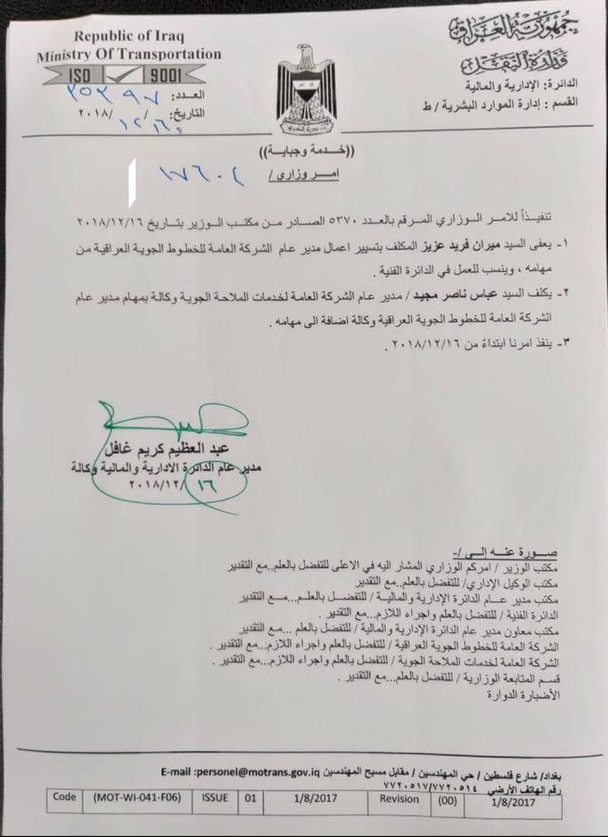 وتضمنت الوثيقة ان "فريد ينسب للعمل في الدائرة الفنية". وتابعت ان "مدير عام الشركة العامة لخدمات الملاحة الجوية عباس ناصر يكلف بمهام المدير عام الخطوط الجوية العراقية وكالة اضافة الى مهامه".