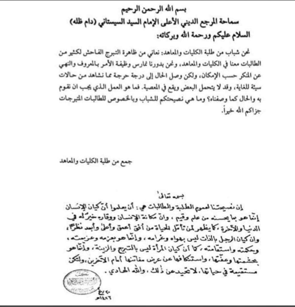 رد المرجع الديني الاعلى اية الله العظمى السيد علي السيستاني {دام ظله} على ظاهرة التبرج الفاحش في الكليات والمعاهد.