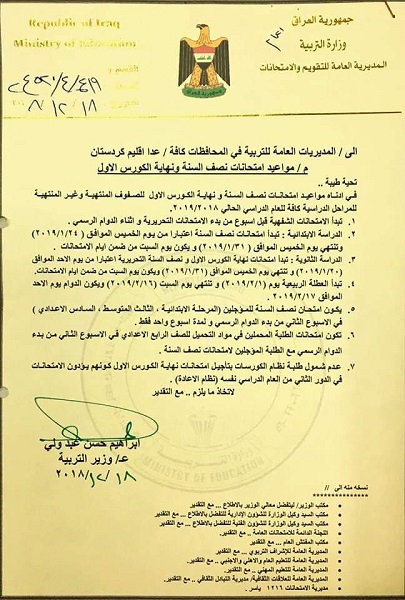 وذكر المكتب الاعلامي للوزارة اليوم اليوم أن " المديرية العامة للتقويم والامتحانات اصدرت تعميماً الى المديريات العامة للتربية في المحافظات كافة / عدا كردستان ، ينص على بدأ الامتحانات الشفهية قبل اسبوع من عملية بدأ الامتحانات التحريرية وأثناء الدوام الرسمي ، أذ تكون الامتحانات الخاصة بالمرحل الابتدائية اعتباراً من يوم الخميس الموافق 24 من شهر كانون الثاني للعام القادم وتنتهي يوم 31 من نفس الشهر ، على أن يكون يوم السبت من ضمن ايام الامتحانات ، أما بالنسبة للدراسة الثانوية فستبدأ امتحانات نهاية الكورس الاول ونصف السنة التحريرية اعتباراً من يوم الأحد الموافق 20 من شهر كانون الثاني القادم ، وتُغلق يوم الخميس 2018/1/31 من ذات الشهر أيضاً ، على أن يُحسب يوم السبت كذلك ضمن أيام الامتحانات".
