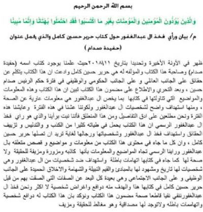 وأصدر وجهاء «فخذ آل عبد الغفور»، وهو الفخذ الذي ينتمي إليه صدام حسين ضمن قبيلة البوناصر، بيانا يهاجم مذكرات حفيدته، ويصفها بـ«الكذب والتدليس وتزييف الحقائق ومهاجمة شخصيات من آل عبد الغفور لغاية تريد حرير حسين كامل أن تصلها»، حسب البيان بعد نشره على الصفحات الشخصية لبعض أقارب صدام حسين، كما تم توزيعه على عدد من الصحف العراقية والعربية، ويقصـــد البيان هـــنا محاولة تـــبرئة حسين كامل من مسؤولية انشقاقه عن النظام.