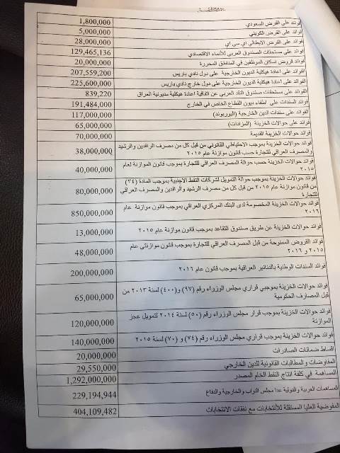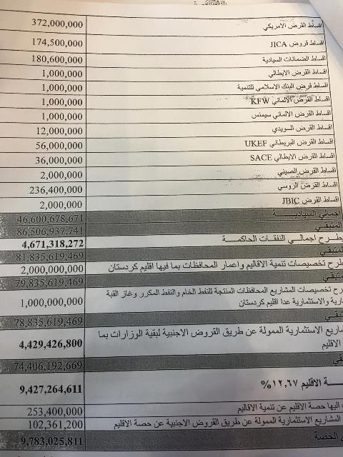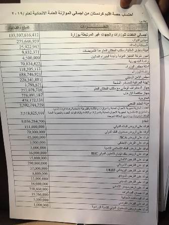 العراق _الكوثر: نشرت وسائل الاعلام العراقية جداول نفقات الوزارات ومؤسسات الدولة في عموم البلاد ضمنها وزارات ومؤسسات كردستان العراق في الموازنة الجديدة للبلاد والتي من المقرر التصويت عليها خلال الايام المقبلة .