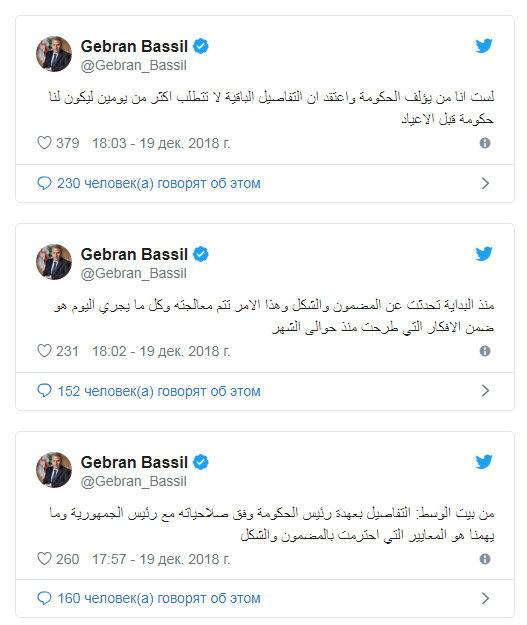 وكشفت وكالة "رويترز" نقلا عن مسؤول لبناني أن وزير الخارجية اللبناني جبران باسيل سيحتفظ بمنصبه في الحكومة الجديدة، مضيفا أن وزير المالية علي حسن خليل من المقرر أن يحتفظ أيضا بمنصبه، كما نقلت الوكالة عن مصدر سياسي، أن إلياس بو صعب سيتولى منصب وزير الدفاع.