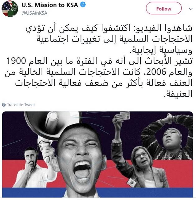 نشرت سفارة واشنطن، عبر حسابها الرسمي في موقع "تويتر"، تغريدة مرفقة بمقطع فيديو قالت فيها "شاهدوا الفيديو: اكتشفوا كيف يمكن أن تؤدي الاحتجاجات السلمية إلى تغييرات اجتماعية وسياسية إيجابية".