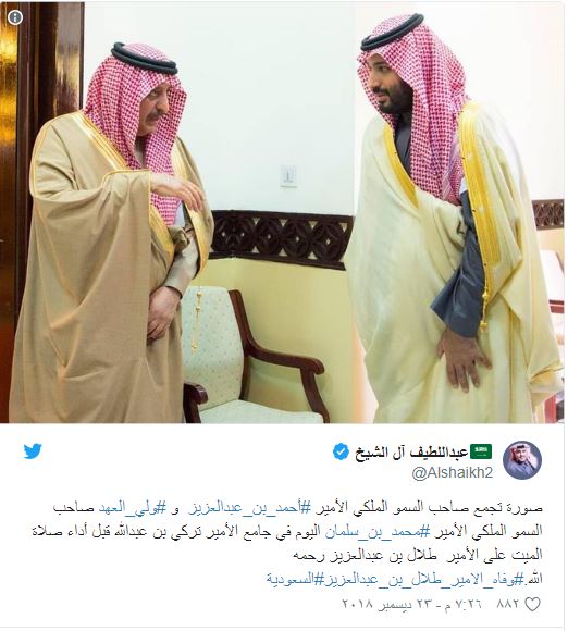 وبحسب الصور المتداولة ظهر ولي العهد السعودي وهو ينصت لعمه الأمير أحمد باهتمام، في جنازة الأمير طلال بن عبدالعزيز التي شيعت يوم الأحد، وحضرها الملك سلمان وعدد كبير من أمراء الأسرة الحاكمة.