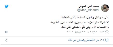 وقال الحوثي في تغريدة عبر حسابه بموقع تويتر: "على إسرائيل والدول الحليفة لها في المنطقة الاعتراف أنها هزمت في سوريا أمام محور المقاومة".