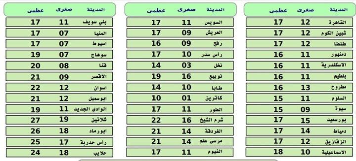 وفيما يلى بيان بدرجات الحرارة المتوقعة غدا على مدن ومحافظات مصر: