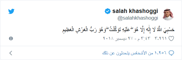 في أول تغريدة له منذ إعلانه عن تقبل العزاء في والده، فاجأ "صلاح خاشقجي" متابعيه بتغريدة جاء نصها: "حسبي الله لا إله إلا هو عليه توكلت وهو رب العرش العظيم".